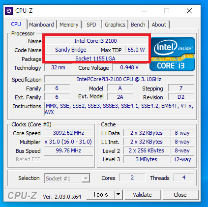 CPU를 보시면 code Name에 Sandy Bridge(샌디브릿지) 라고 되어 있는것을 확인할수 있습니다.
