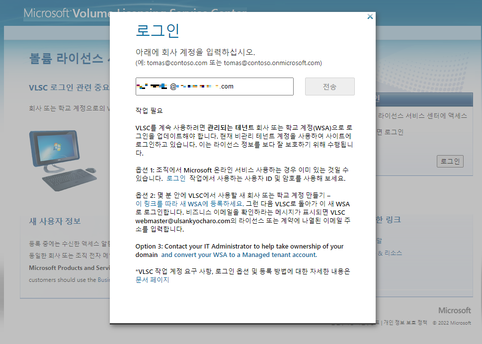 ○○○○@○○○○.onmicrosoft.com 으로 가입하신적이 있으시면 그 계정으로 하시면됩니다.