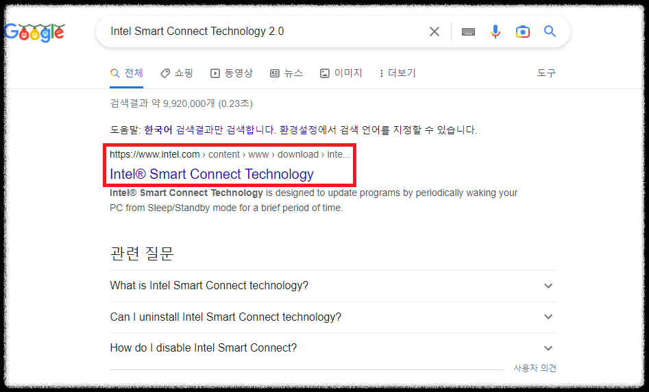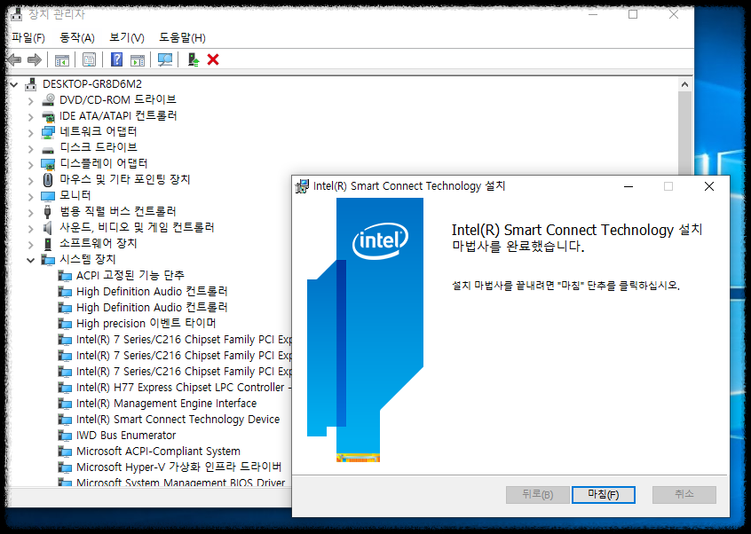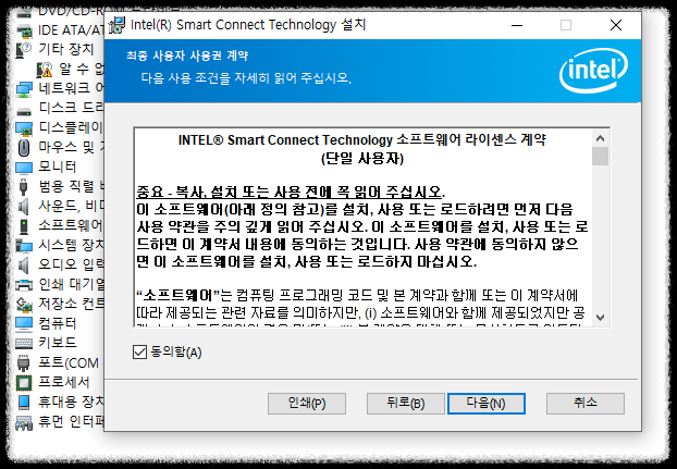 알수없는장치는 사라지고 아까 검색어로 계속 검색했던 Intel Smart Connect Technology Device (시스템장치 아래) 로 변경되었네요