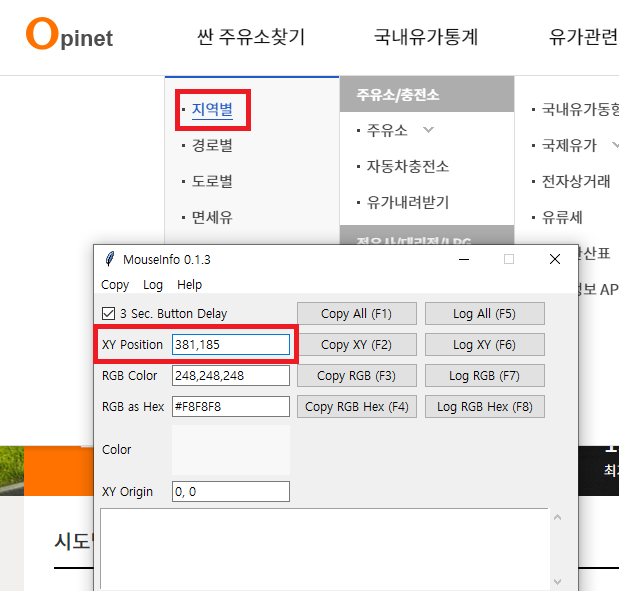 싼주유소 찾기위에 마우스 올리면 마우스 x,y값이 mouseinfo 0.1.3 를 통해서 나타 납니다. X = 416 , Y= 113