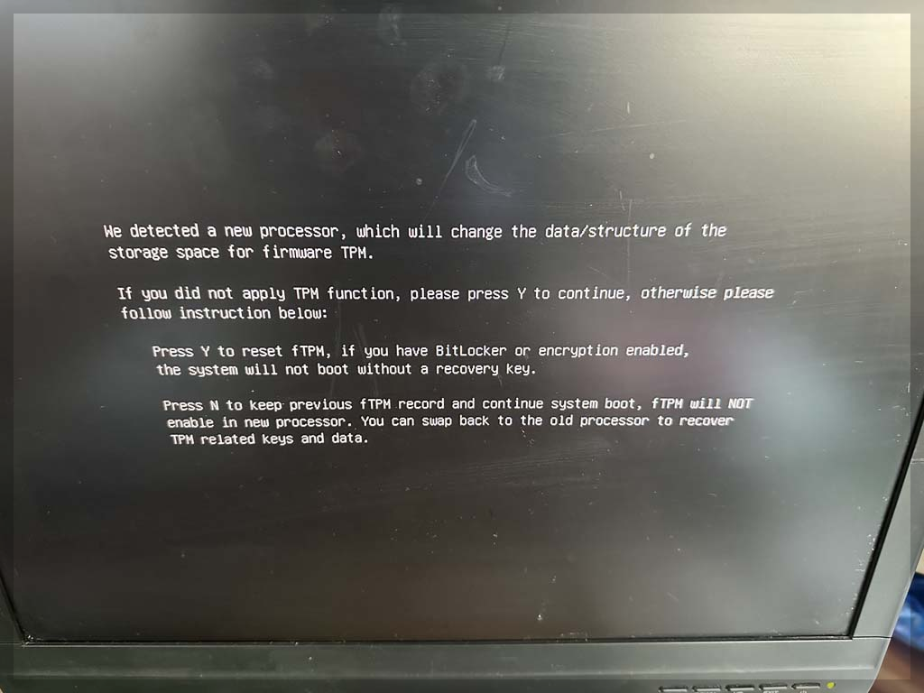 Press N to keep previous fTPM record and continue system boat, flPH will NOT enable in new processor. You can swap back to the old processor to recover