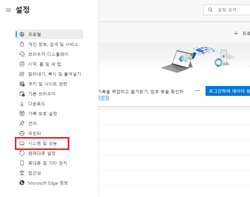 하단쪽 시스템 및 성능 을 클릭 합니다!