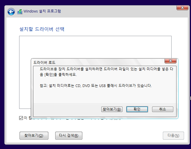 Windows에서 드라이브를 찾을 수 없다는 메시지가 화면에 표시되면 아래 [드라이버 로드] 클릭