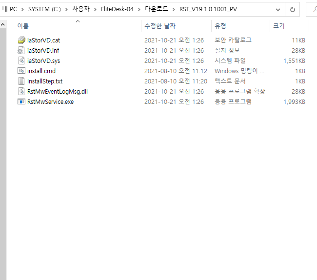 RST_V19.1.0.1001_PV 다운 받아서 압축 풀어준 폴더를 찾아 가서 해당 폴더를 클릭하고 확인해줍니다.