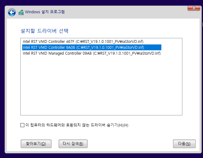 두번째 Intel RST VMD Controller 9A08를 클릭해주고 다음 버튼 누르면 드라이버가 성공적으로 잡힐겁니다.