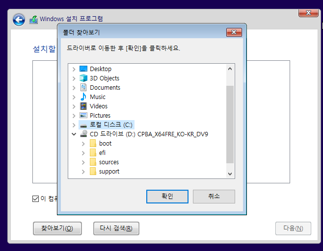 드라이버 로드 창에서 찾아보기 클릭