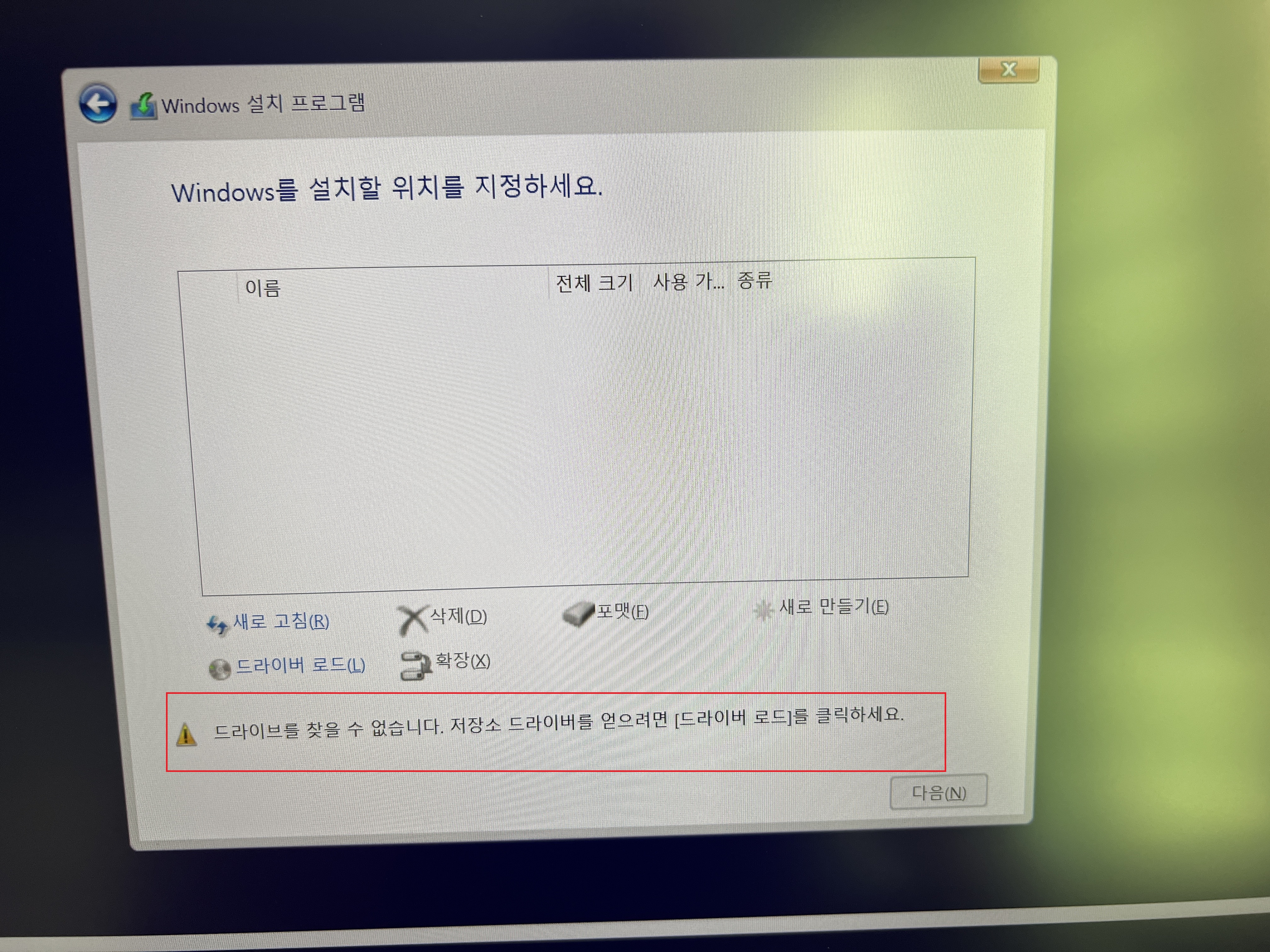 Windows에서 드라이브를 찾을 수 없다는 메시지가 화면에 표시되면 아래 [드라이버 로드] 클릭