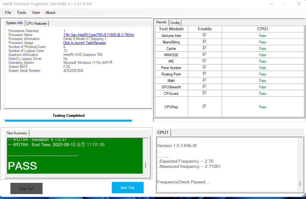 인텔에서 제공되는 프로세서 진단 도구로도 역시 테스트 해보았다.