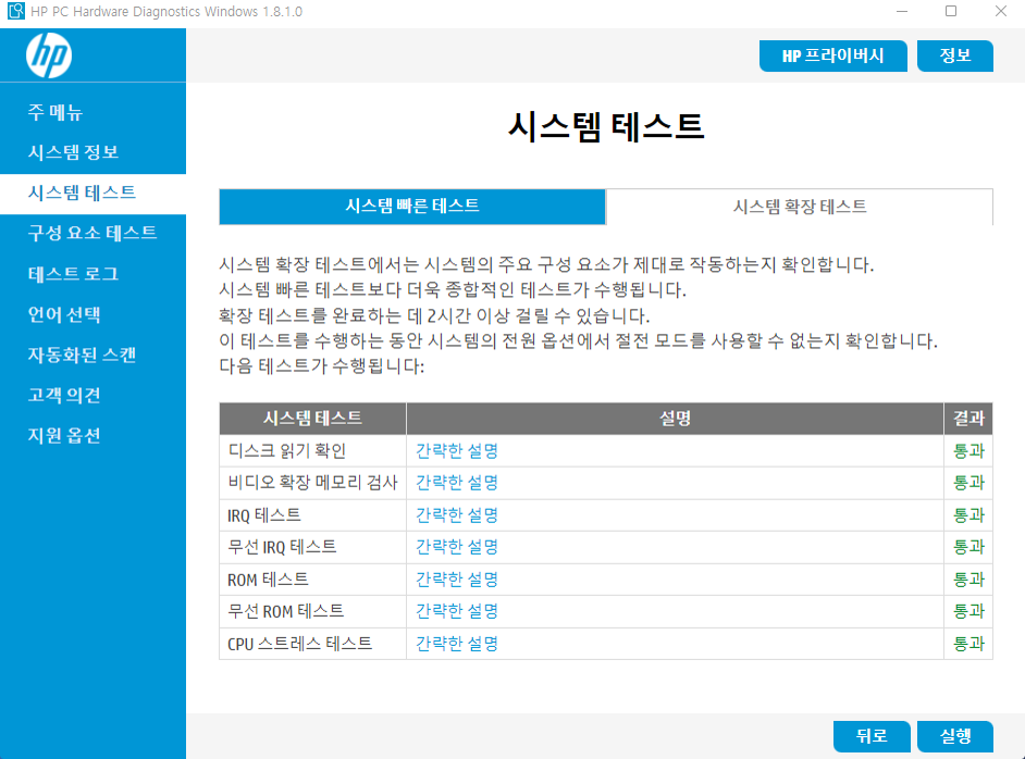 HP에서 제공되는 HP PC Hardware Diagnostics 도구로 테스트를 다해보고