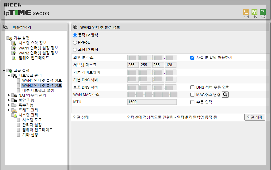 외근이나 트래픽을 많이 사용하지 않은 네트워크는 2번 WAN Port로 이렇게 분산을 시켜줍니다.