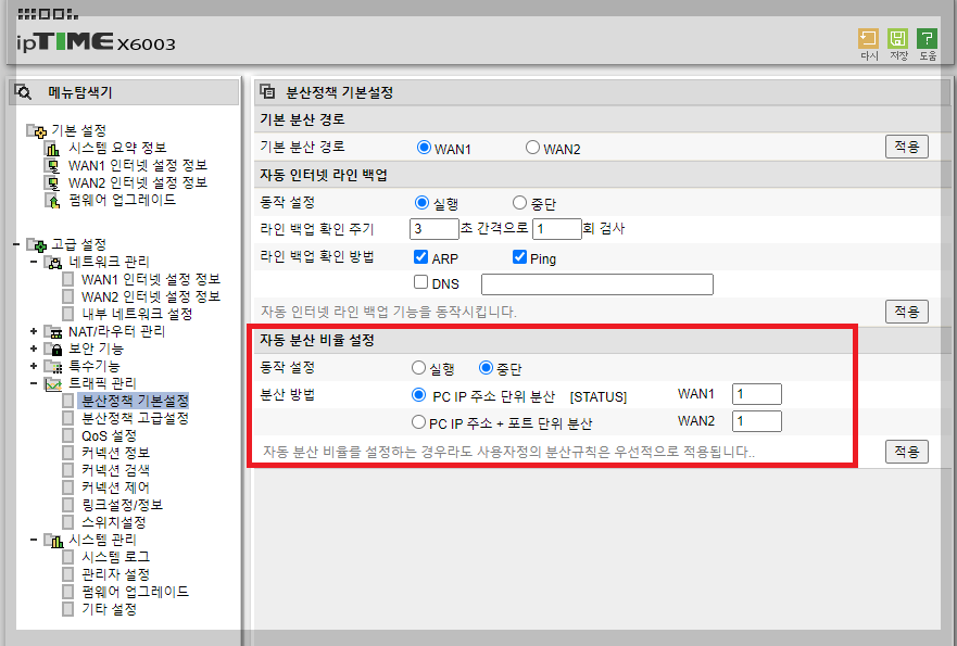 트래픽관리 - 분산정책 기본설정에서는 기본은 1번 WAN으로 하고 분산 비율 설정으로 해도 되고