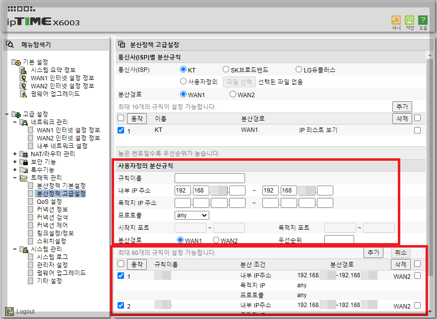 트래픽관리 - 분산정책 고급설정에서는 규칙이름을 정하고 내부 IP 지정하고 분산경로를 WAN1 으로 할지 WAN2로 할지...