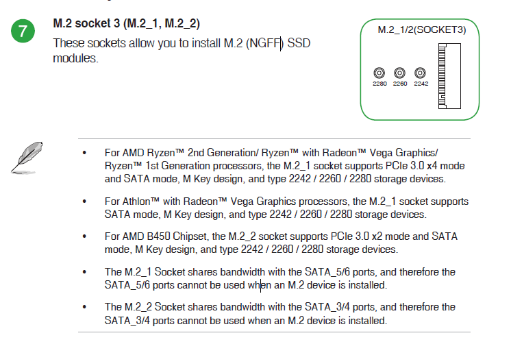 The M.2_2 Socket shares bandwindwidth with SATA_3/4 ports, and therefore the SATA_3/4 ports cannot be used when an M.2 device is installed.