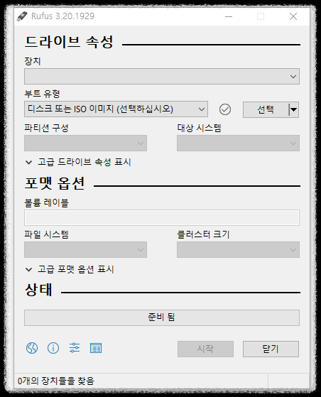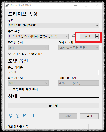 다운을 받고 rufus 단일 파일을 실행 시키면