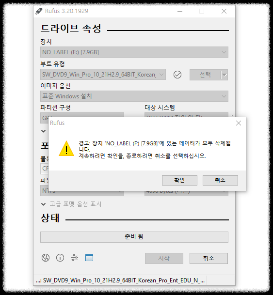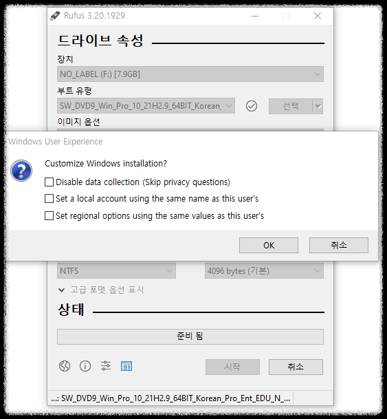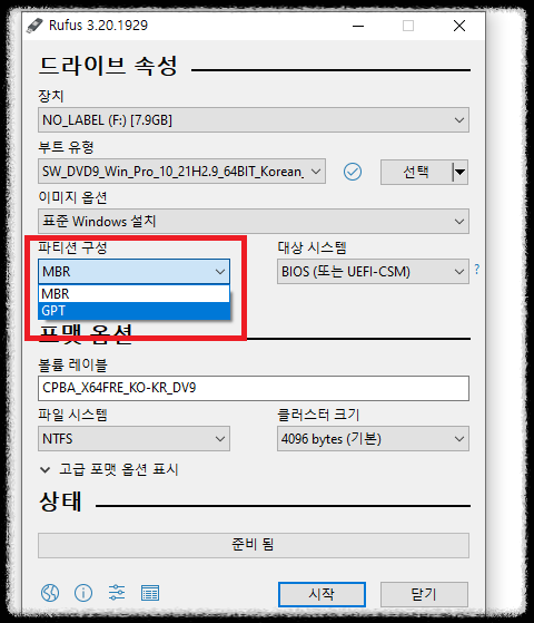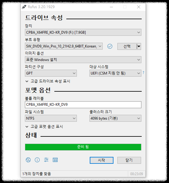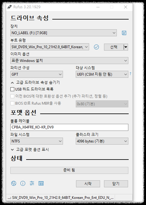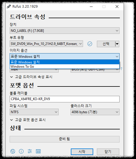 포맷 옵션에는 따로 손댈곳이 없습니다. 그나마 볼륨레이블(이름) CPBA_X64FRE_KO-KR_DV9 이런식으로 USB메모리 이름으로 저장됩니다.