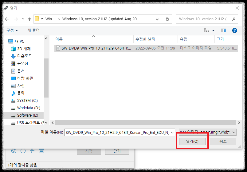 선택을 클릭 하셔서 윈도우 iso 파일이 있는곳으로 이동 한 후 iso 파일을 선택(열기) 해줍니다.