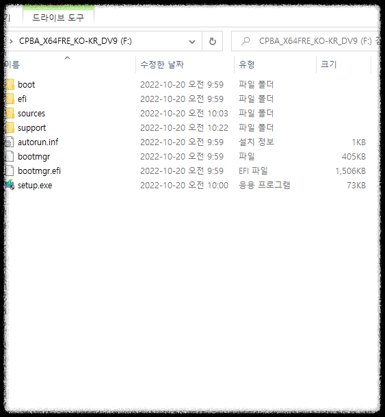 USB메모리를 보니 정상적인 USB 부팅 될수 있는 파일들과 SETUP 파일들까지 잘 만들어 졌습니다.