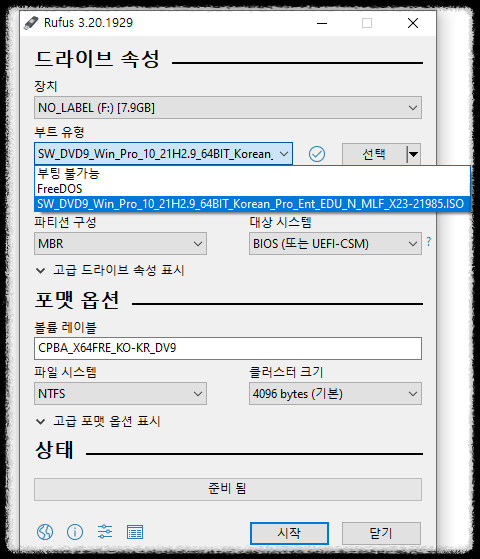 포맷 옵션에는 따로 손댈곳이 없습니다. 그나마 볼륨레이블(이름) CPBA_X64FRE_KO-KR_DV9 이런식으로 USB메모리 이름으로 저장됩니다.