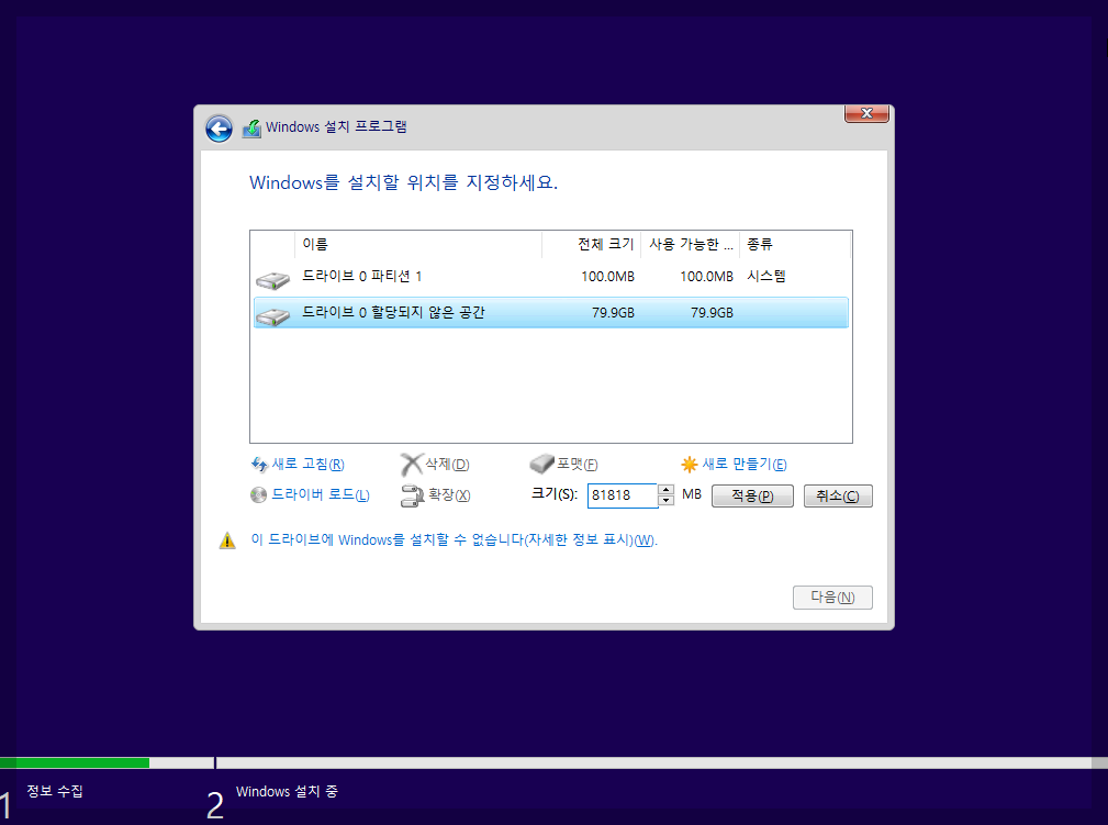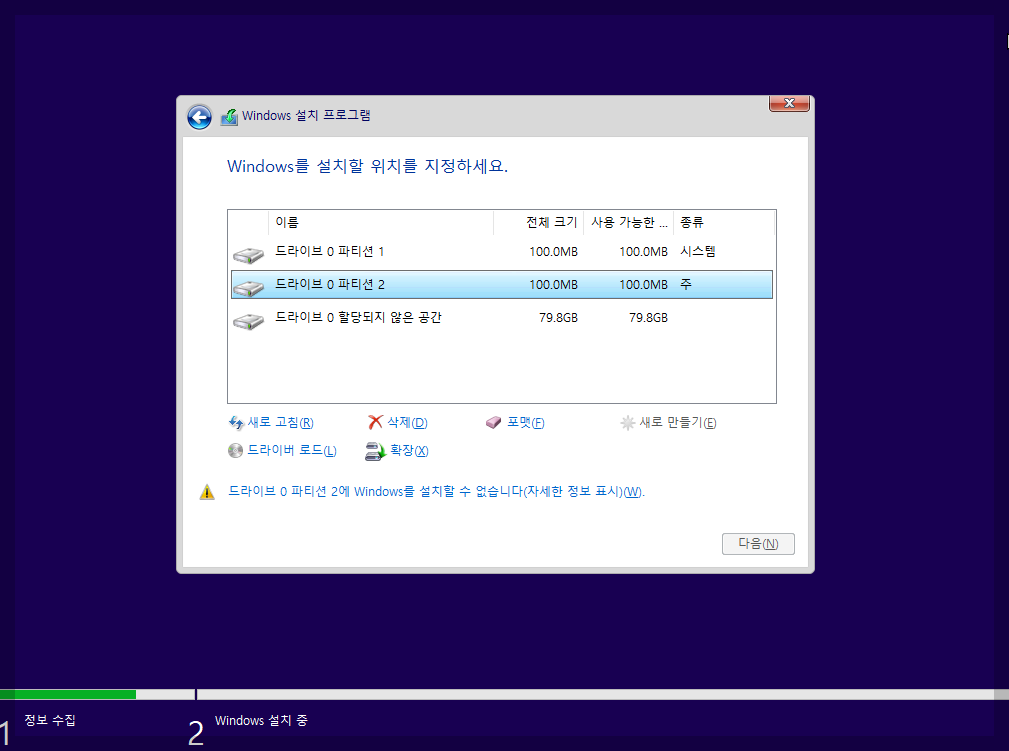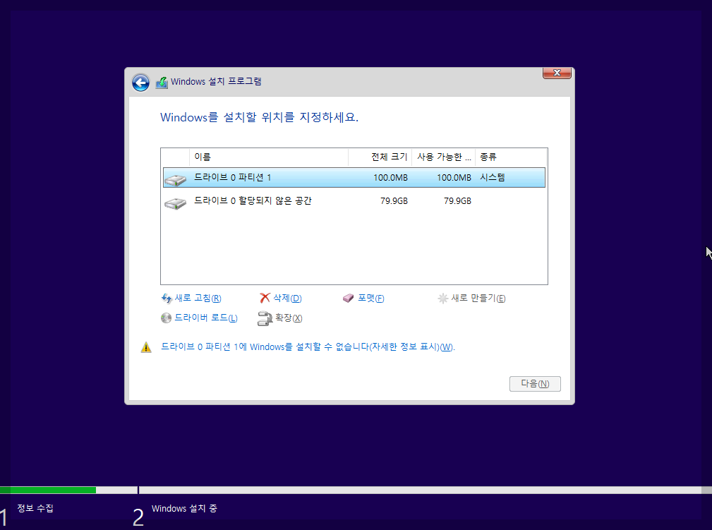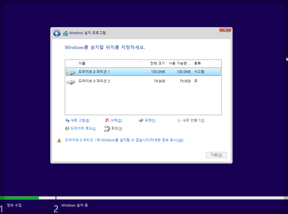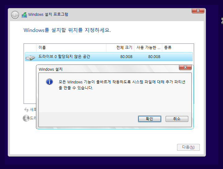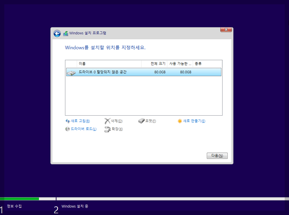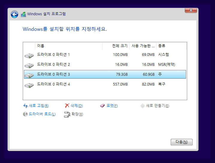 Windows 설치할 위치를 정하세요 에서