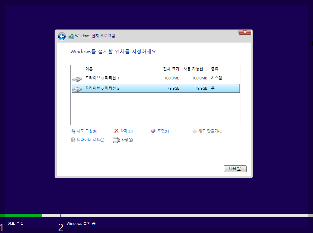 종류 (주파티션) 파티션 2번을 클릭해서 다음 버튼 누르고 정상적인 설치를 하시면 됩니다.