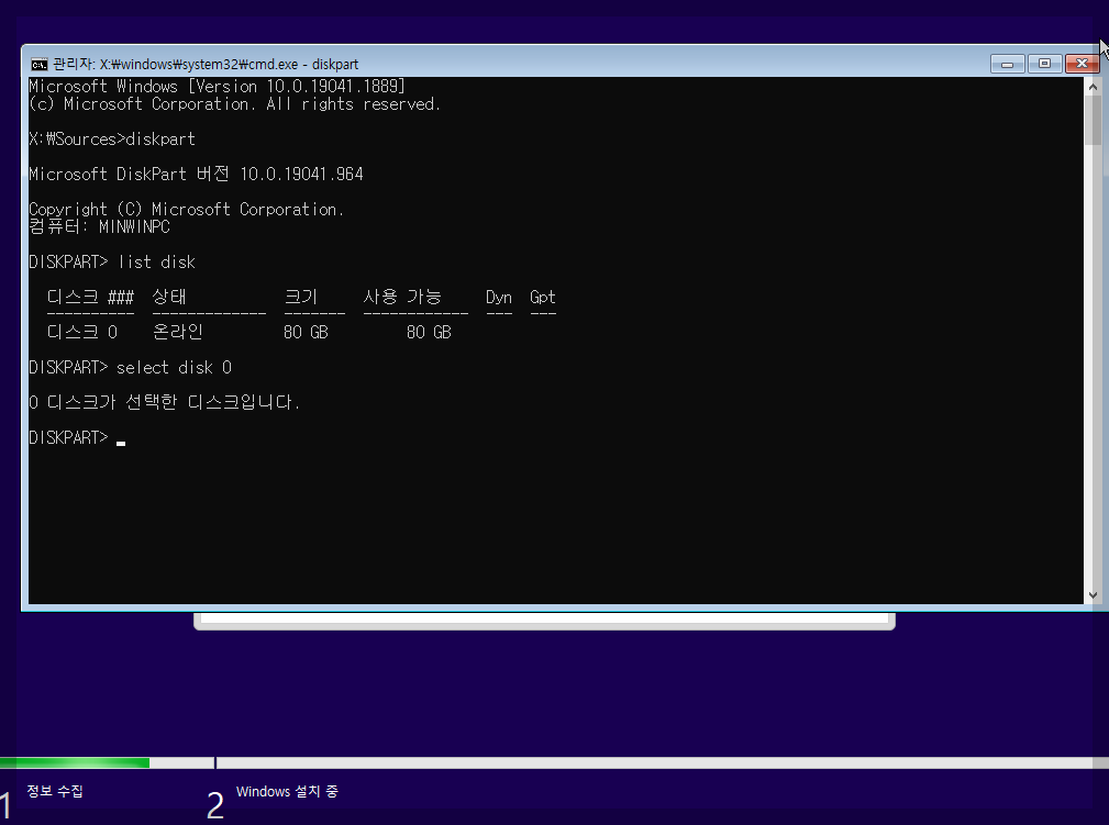 세번째 명령어는 select disk 0