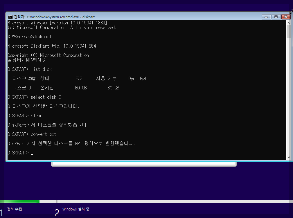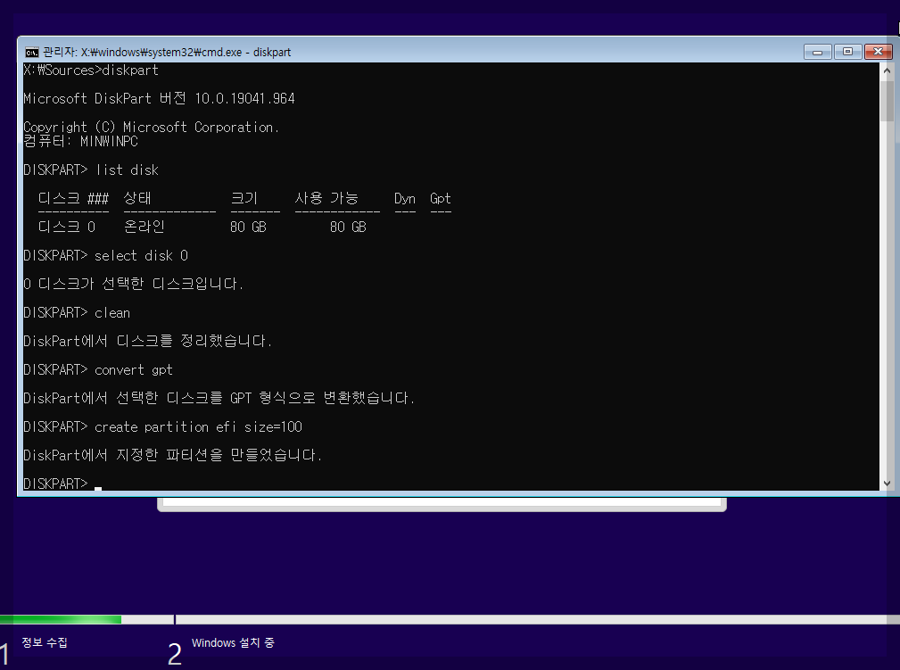 디스크 형식을 바꾸는 명령어 인데 우리가 지금 하는 설치가 efi 방식이기때문에 예전버전(mbr) 이나 efi(gpt)방식이 준비 되지 않으면 설치가 정상적으로 되지 않기 때문에 먼저 디스크형식을 바꾸고 시작합니다.