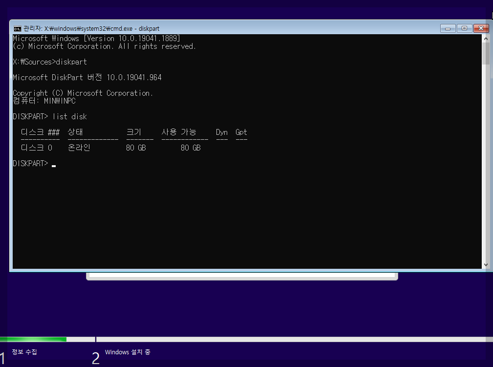 diskpart 명령어를 입력 하셨다면 사진과 같이