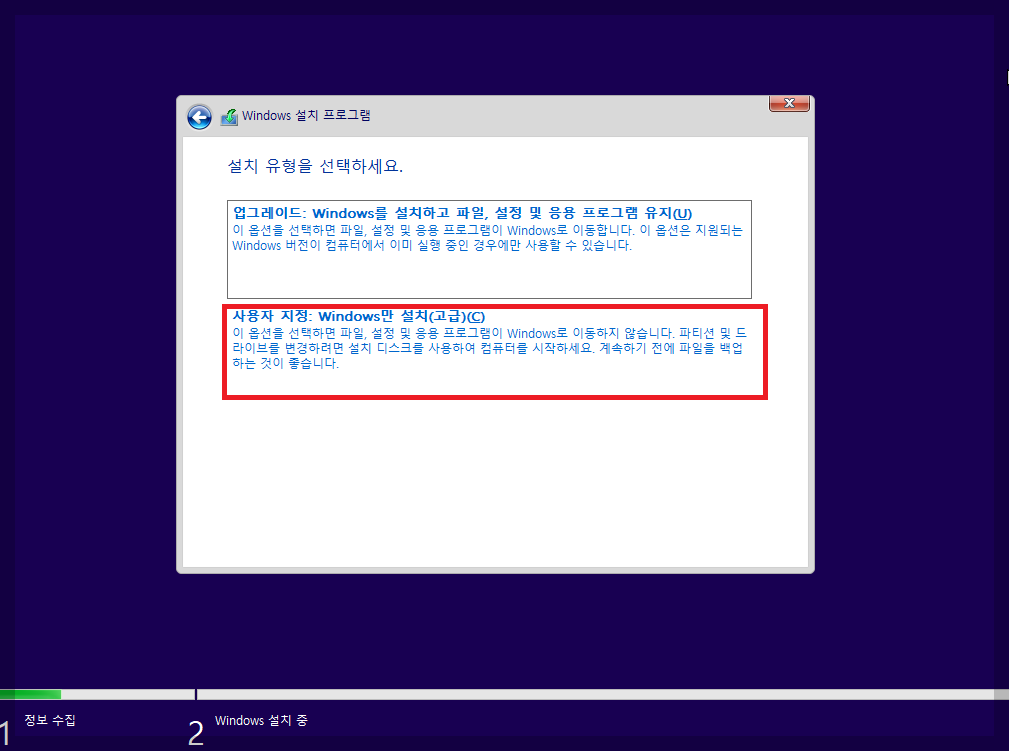 사용하던 윈도우 버전이 있다면 업그레이드 해도 되지만 좀 지저분하게 설치가 되어서 사용자 지정으로...