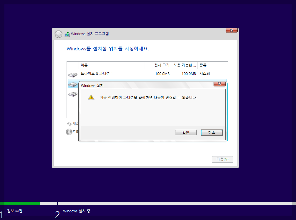 당연히 100MB 시스템 파티션에는 설치 할수 없습니다 라고 멘트가 아래에 나오네요.