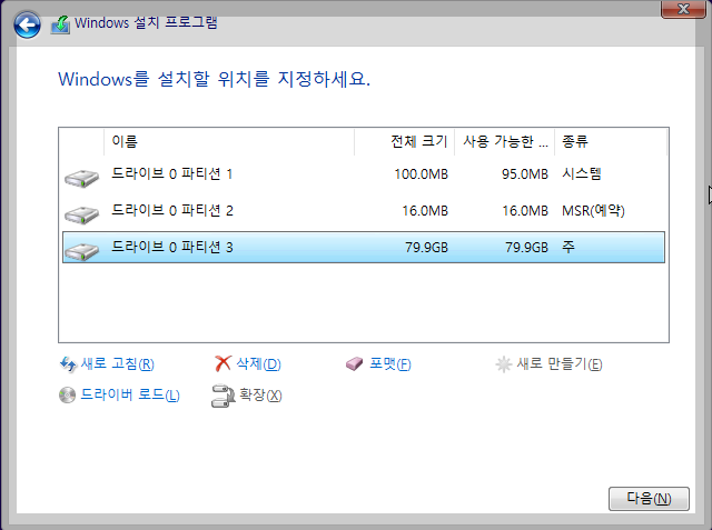 아래버튼 중에 새로 고침을 클릭하면 수동으로 지정해준 파티션이 보일겁니다. 100MB 짜리 종류로는 시스템으로